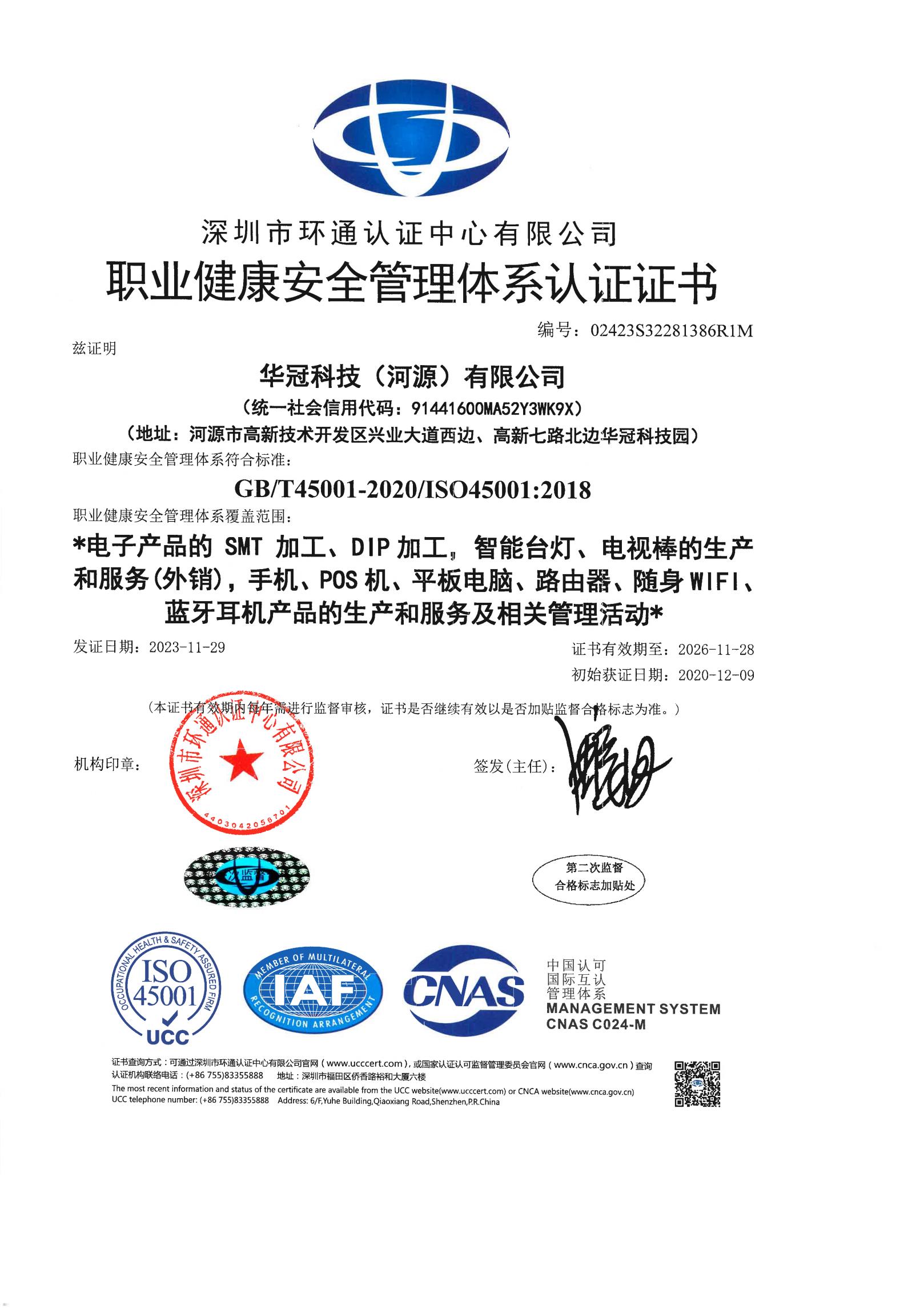 華冠ISO45001健康安全管理體系證書(英文)